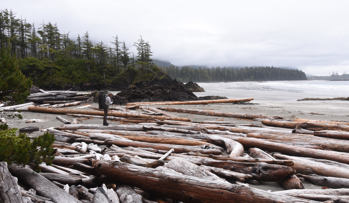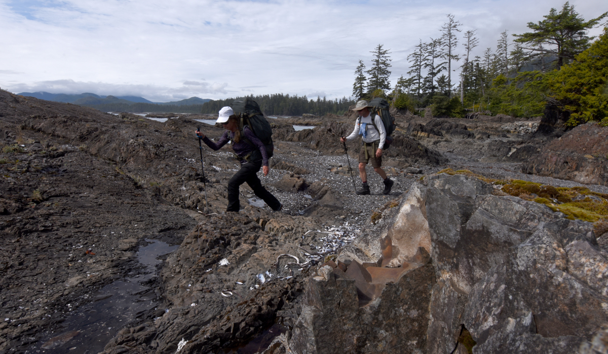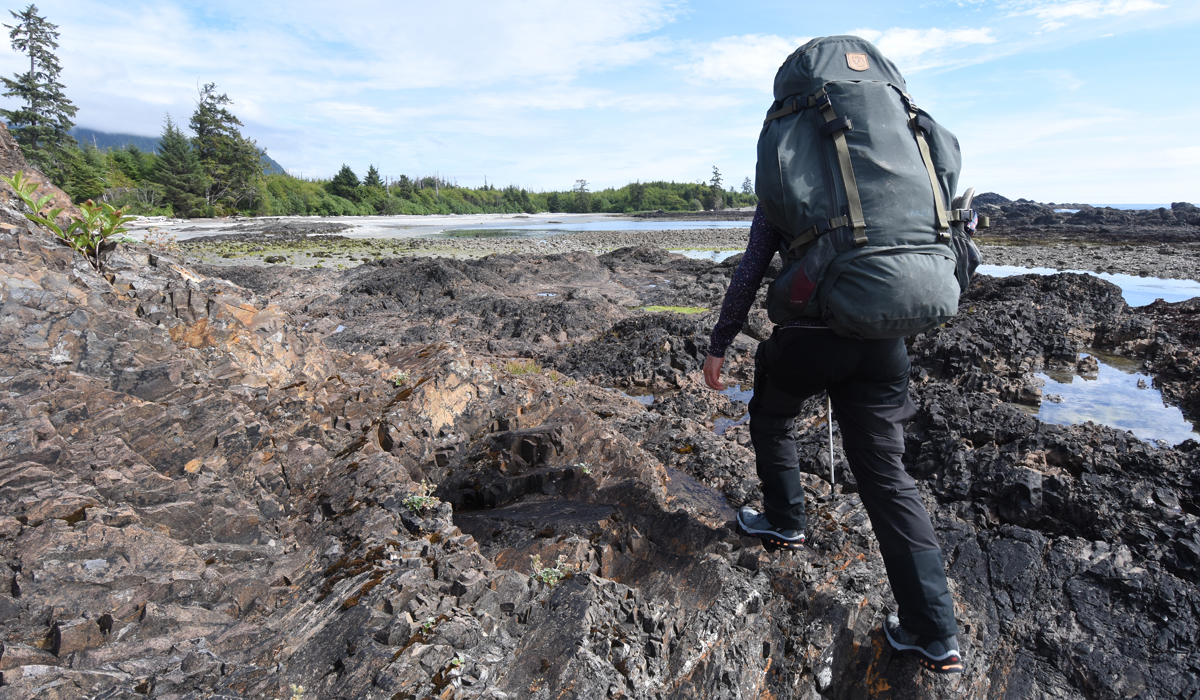 Out first days out were a lot about getting familiar with our gear. As I have written elsewhere, it’s essential that you have rugged and reliable gear for a committed wilderness trip like this. We had not hiked in our new Fjallraven Kajka packs fully loaded, so it was a bit of a learning curve to get them adjusted properly – but these packs are amazing for the many ways you can customize the fit to every part of your body and to the load you are carrying. They were very heavy, and we noted that every time we took them on or off – but they felt fine on our back. Another piece of equipment we were still breaking in were our new Salomon Quest 4D 3 GTX hiking boots – which we loved right away partly because of their comfortable fit and flexibility, but came to appreciate as life-savers once we hit the really rugged stuff on later days: cliffs to round just south of here and on Nootka, and miles of slippery boulders on Hesquiaht.