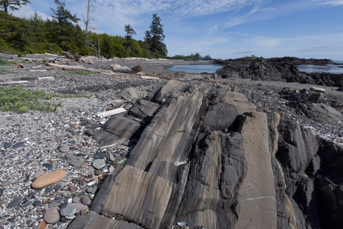 One of the things that slowed us down was the geology! Especially on the Tatchu Peninsula section – these are sedimentary rocks deposited in the deep ocean, but showing evidence of current flow. We saw so much – fossils, magmatic rocks with gas bubbles in them (now filled in with minerals), faults and folds… and pretty much every time, I had to drop my pack and get down on my hands and knees to check it out.